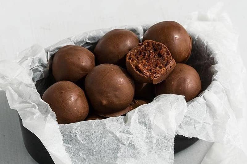 Soak the dates in water until they soften, then blend all the ingredients together, roll into balls and refrigerate for an hour. If you're feeling truly indulgent, you can coat the balls in 40g melted dark chocolate and refrigerate for another half an hour.